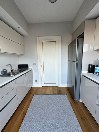 The kitchen is equipped with a refrigerator, dishwasher, electric stove, oven, balcony.
